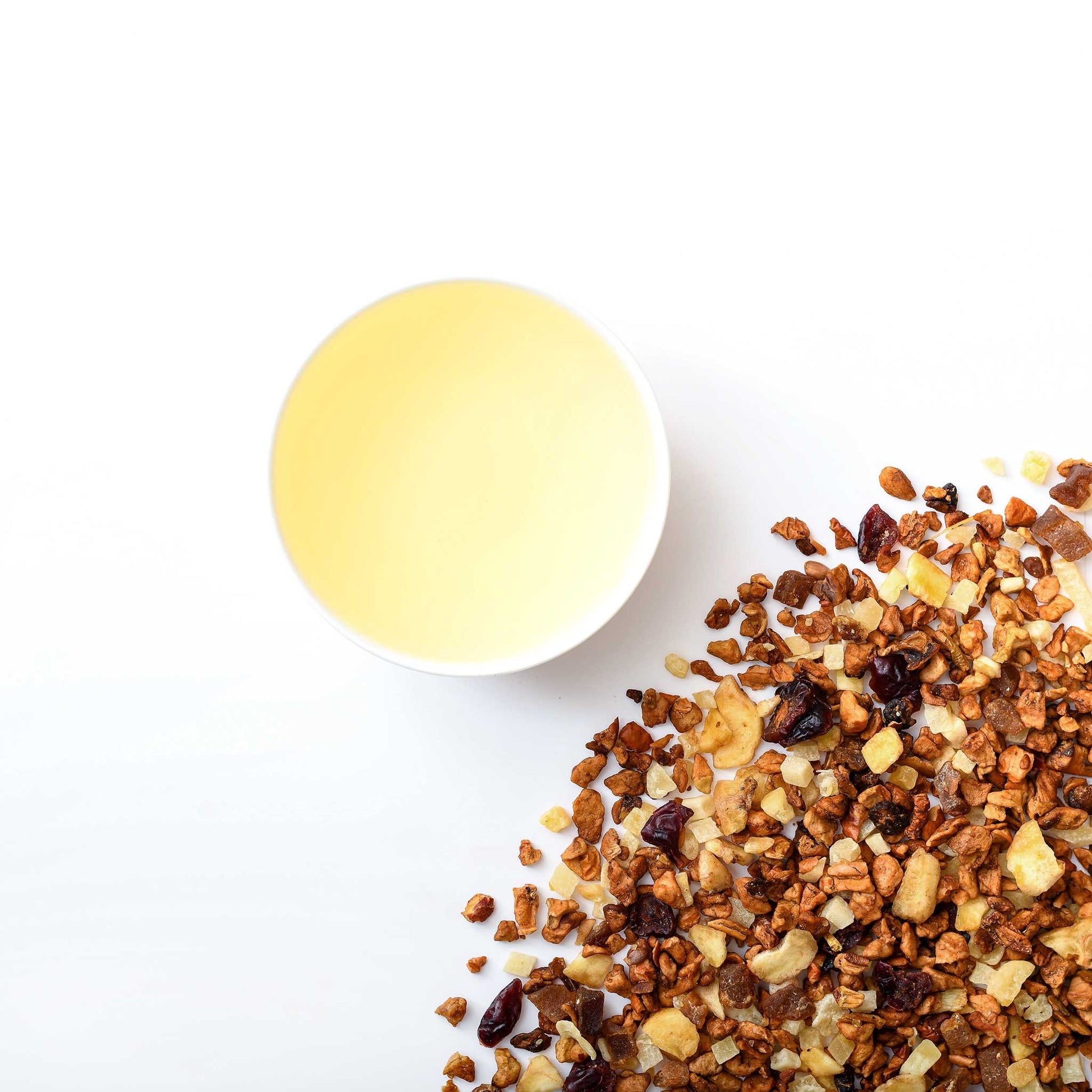 Apfelstücke (geröstet), Mangostücke (Mango, Rohrzucker, Säuerungsmittel: Zitronensäure (E330)), Bananenstücke (Bananen, Kokosnussöl, Rohrzucker, natürliches Aroma), Papayastücke (Papaya, Rohrzucker, Säuerungsmittel: Zitronensäure (E330)), Cranberries (Cranberries, Zucker, Trennmittel: Sonnenblumenkernöl), Birnenstücke (Birne, Trennmittel: Reismehl), Aroma, Maracujafruchtgranulat (Maltodextrin, Frucht (Maracujasaftkonzentrat), Geliermittel: Natriumalginat (E401)), natürliches Aroma