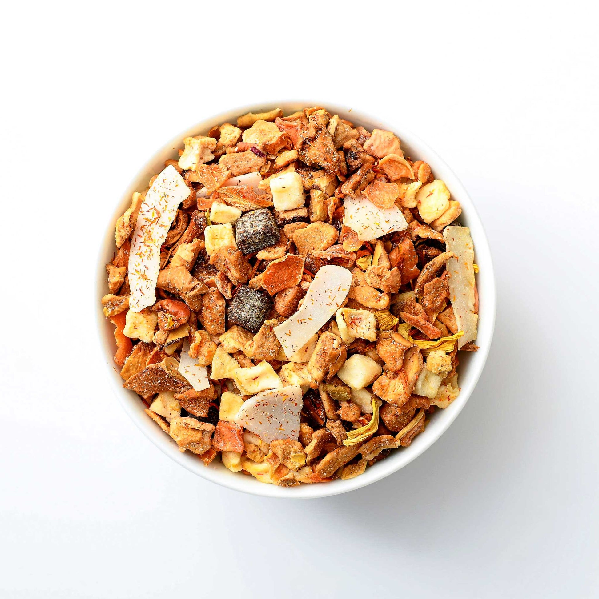 Apfelstücke (geröstet), Karottenstücke, Apfelstücke weiß, Kokoschips, Pfirsichstücke (Pfirsich, Trennmittel: Reismehl) (5%), Aroma, Ascorbinsäure Pulver, Saflorblüten, Sonnenblumenblütenblätter