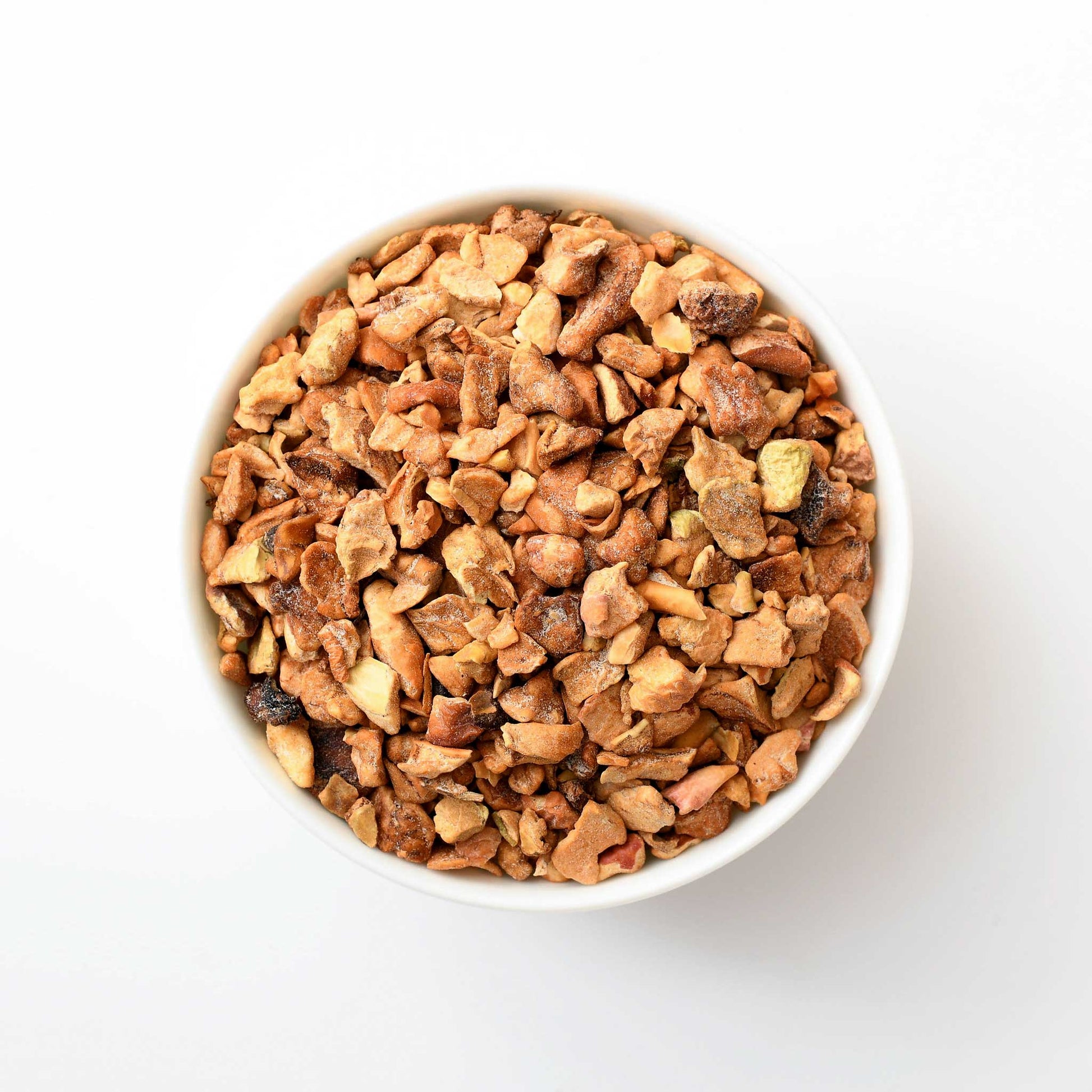 Apfelstücke (geröstet) (98%), Aroma, Acerolafruchtpulver (Saccharose, Ascorbinsäure, Maltodextrin, Acerlora-Saftkonzentrat, Siliciumdioxid)