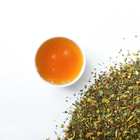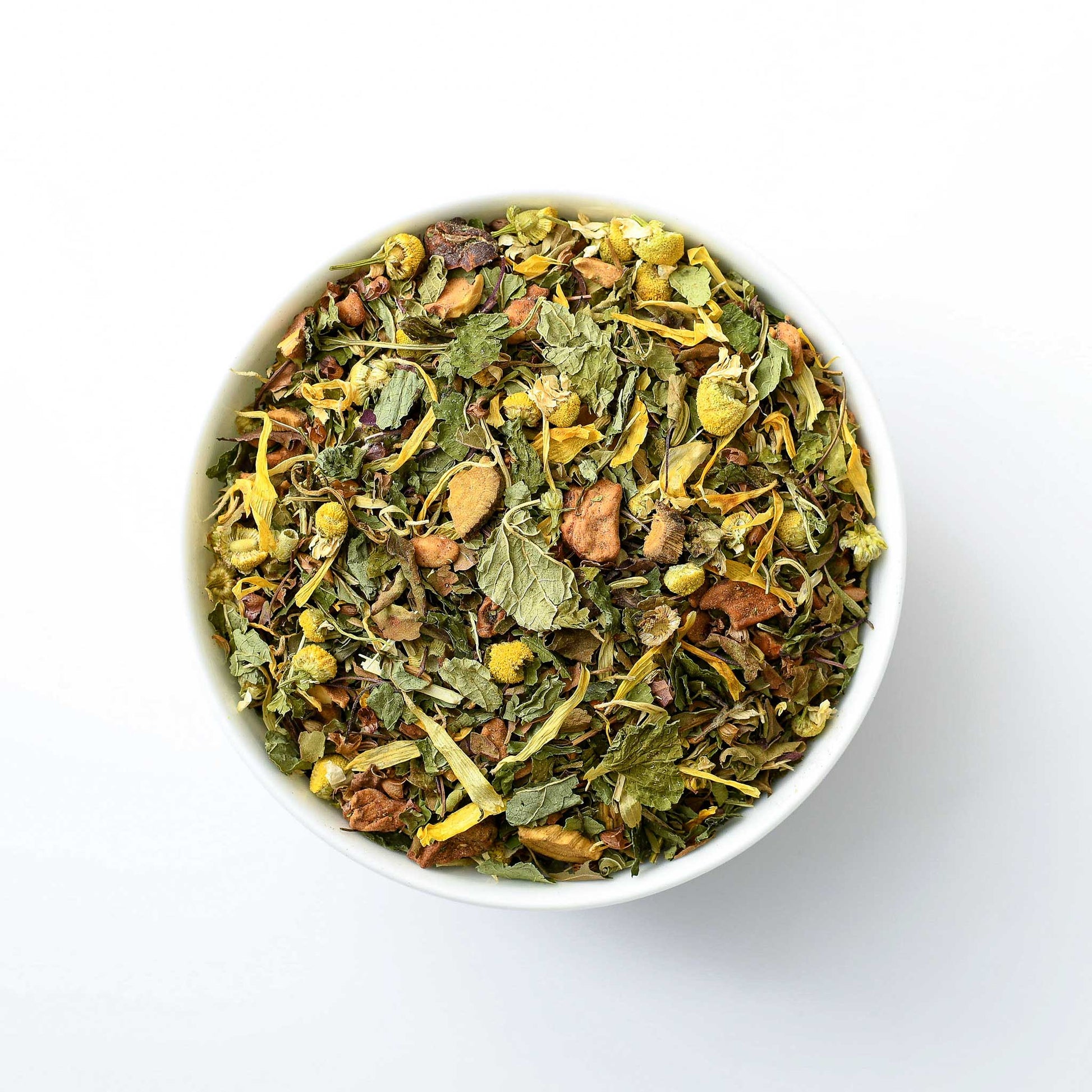 Melisse, Tulsi, Apfelstücke (geröstet), Süßholz, Pfefferminze, Kümmel, Kamille, Fenchel, Rosmarin, Spearminze, Ringelblumenblütenblätter, natürliches Aroma